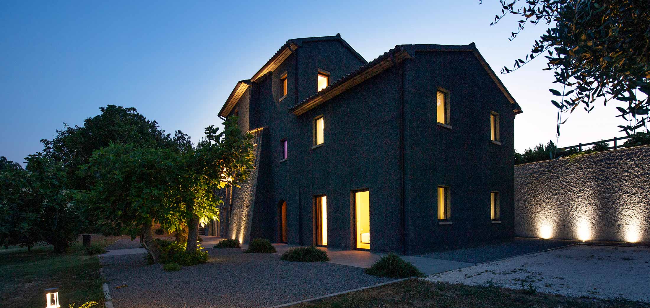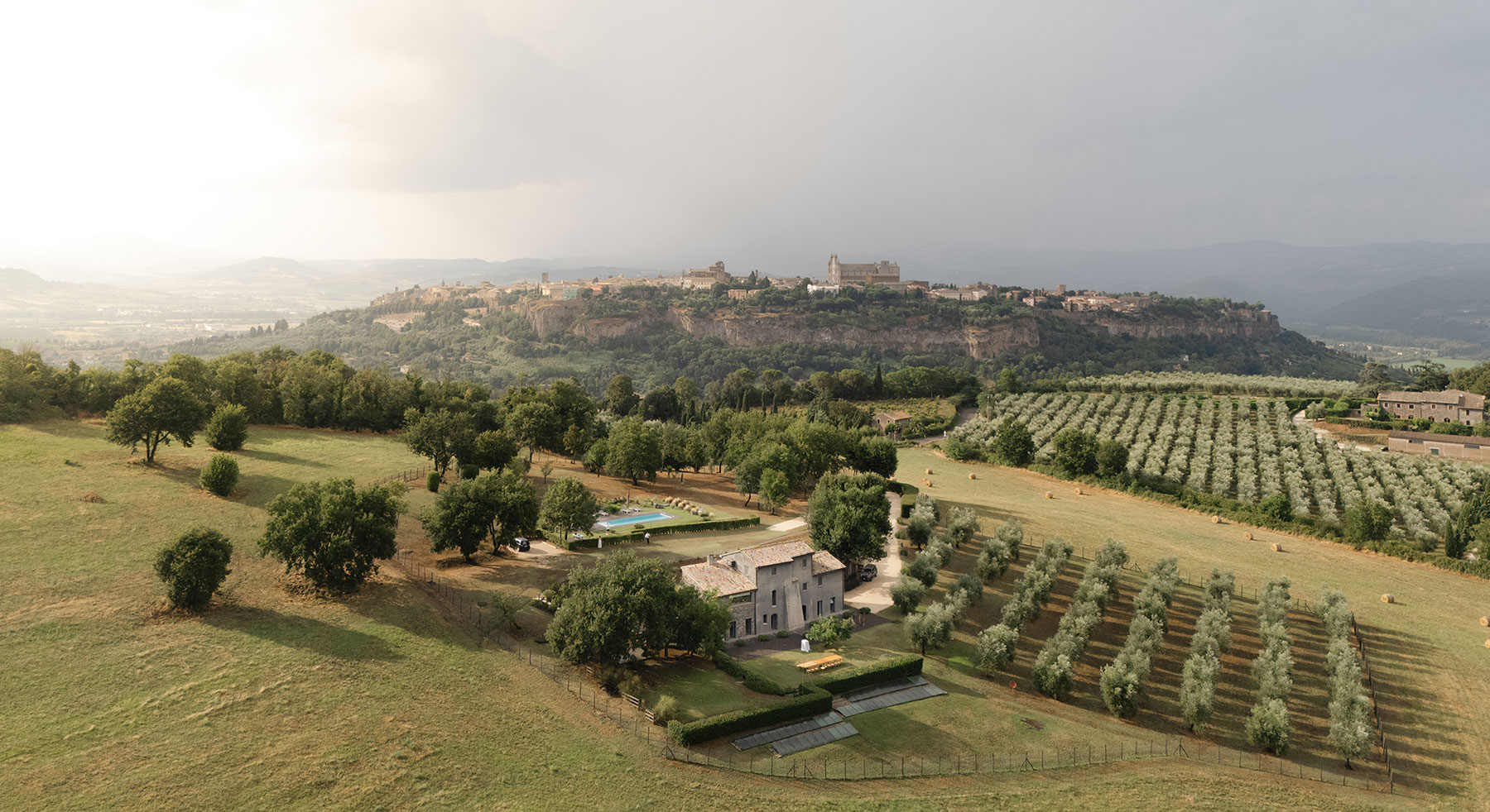 Al confine con la Tuscia, Rara Factory è una residenza insediata nel luogo che ospitava un antico casale contadino. Reinterpretata in chiave contemporanea e trasformata in una villa dal sapore industriale, la casa è distribuita in volumi distinti su tre piani. La vista spazia a 360 gradi, tra campi coltivati, il fieno che ingiallisce e uno skyline naturalistico emozionante. Circondata da terreni agricoli e da un giardino di erba spontanea con piante autoctone, olivi e alberi da frutta, fa da corollario alla proprietà una bella piscina al sale di impianto moderno, in linea con il resto dell’ambiente, un piccolo gioiello di design contemporaneo. Immersi nell’acqua della piscina, filtrato dal boschetto di querce e noccioli, affiora il maestoso Duomo di Orvieto sulla rocca tufacea. Un invito per i nostri ospiti a visitare anche il centro storico.